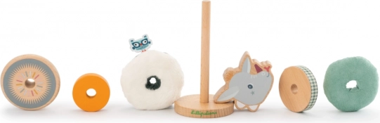Sada obsahuje 4 drevené časti, 2 textilné časti a stabilný drevený podstavec. Rozmery hračky sú 8 × 8 × 18,8 cm. Textilné prvky možno jednoducho udržiavať praním na 30 °C (jemný cyklus) – vždy bez drevených častí.