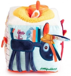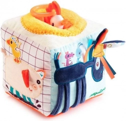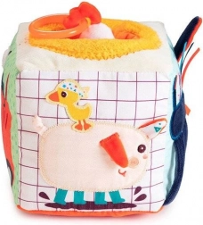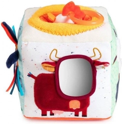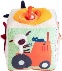 Táto mäkkučká kocka je plná prekvapení: kravička Rosalie so zrkadielkom, ovečka Yvon na traktore, káčer Gaston na prasiatku Simone, somárik Ignace s bohatou hrivou z prúžkov a sliepočka Paulette vo svojom mäkkom hniezdočku. Pri zatrasení kocka vydáva zvuky hospodárskych zvierat – úlohou dieťaťa je nájsť, ku ktorému hrdinovi patria.
