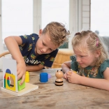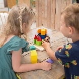 Hrou deti rozvíjajú jemnú motoriku a zrakové schopnosti so žiarivými farbami a tvarmi.