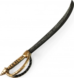 - Zakrivená čepeľ so striebornými ornamentmi, zlatisto-čierna rukoväť s ochranou ruky