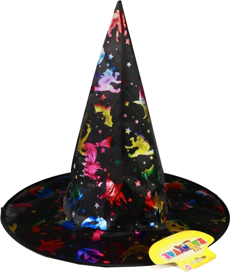 Klobúk zdobia farebné holografické motívy, ktoré dodávajú magický vzhľad.