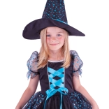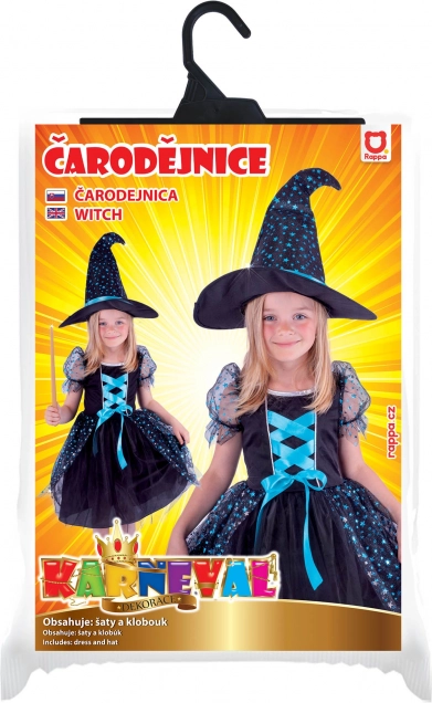 Tento čarovný kostým čarodejnice vo veľkosti S je určený pre deti vo veku cca 4–6 rokov (výška 105–116 cm). Kombinácia čiernej a sýto modrej farby s hviezdnym motívom vytvára efektný vzhľad, ktorý si malé čarodejnice zamilujú. Súčasťou je aj špicatý klobúk zladený so šatami.