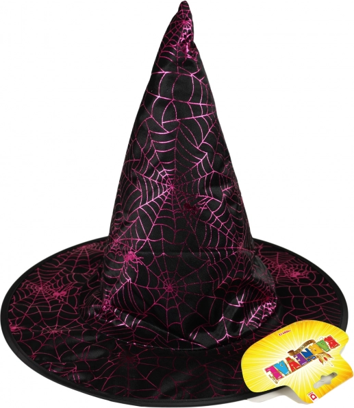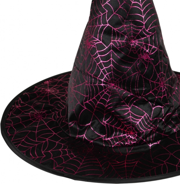 Klobúk má čiernu farbu so žiarivými fialovými pavučinami, čo ho robí ideálnym doplnkom pre každý strašidelný kostým.