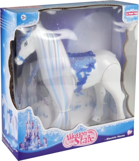 Predstavujeme elektrického koňa z kolekcie Zimné kráľovstvo, ktorý je dokonalým spoločníkom pre malých milovníkov rozprávok a fantázie. Tento čarovný kôň ponúka nasledujúce funkcie: