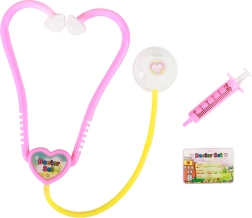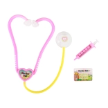 Detský kostým zahŕňa ružový stetoskop a žltú striekačku, ktoré vyzerajú ako skutočné lekárske nástroje.