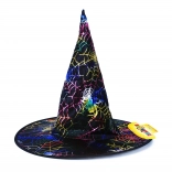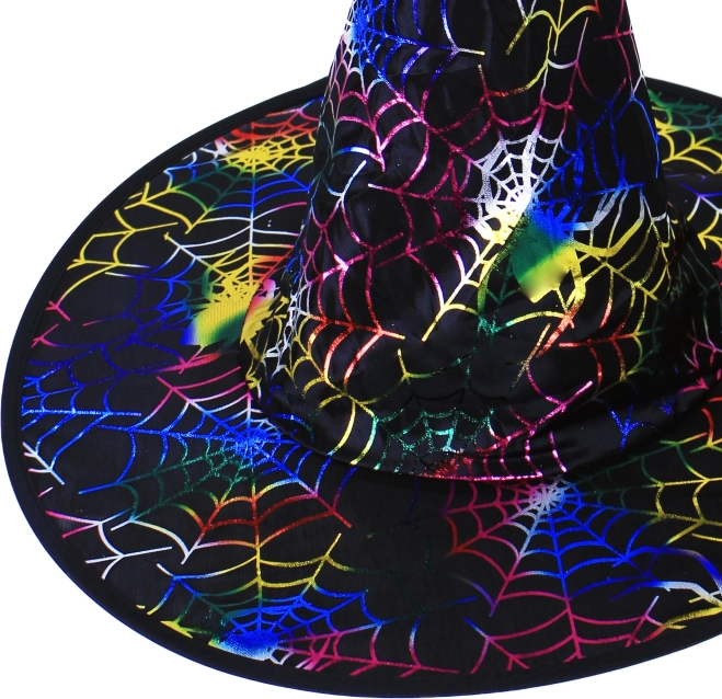 Dodajte svojmu halloweenskému či karnevalovému kostýmu jedinečný nádych s elegantným čiernym klobúkom čarodejnice zdobeným farebnými pavučinami. Ľahký a poddajný materiál sa pohodlne nosí, zatiaľ čo široká krempa a kužeľová špička vytvárajú ikonickú siluetu.