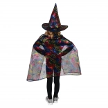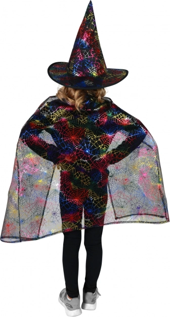 Očarte malých kúzelníkov a čarodejnice štýlovým kostýmom s plášťom a klobúkom zdobenými metalickými pavučinami v dúhových farbách. Ľahký a pohodlný set na Halloween, karneval aj tematické párty, ideálny pre deti 3–7 rokov.