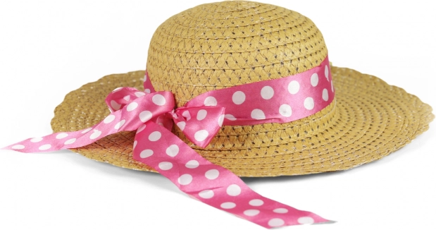 Krásny detský slamený klobúk, ideálny pre malé parádnice, zdobený ružovou stužkou s bielymi bodkami.
