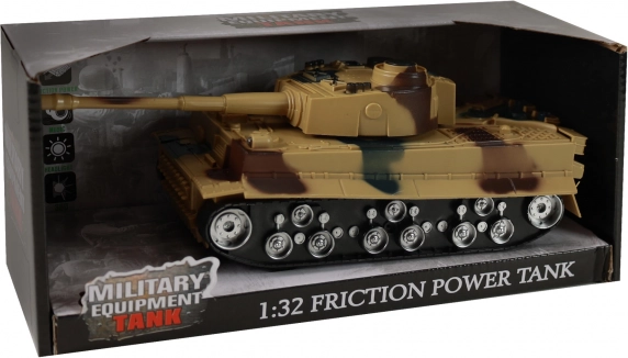 Vďaka frikčnému (zotrvačníkovému) mechanizmu sa tank po natiahnutí rozbehne vpred. Praktická mierka 1:32 skvelo padne do ruky.
