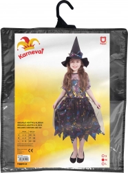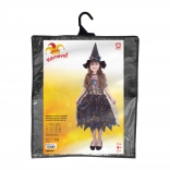 Doprajte malej čarodejnici perfektný prevlek, ktorý vynikne na každej párty. Ľahké a príjemné šaty v čierno‑fialovom ladení zdobia pestré halloweenske motívy, ktoré dodajú kostýmu hravý a magický vzhľad. Súčasťou je zladený špicatý klobúk, ktorý dotvára klasický čarodejnícky štýl.
