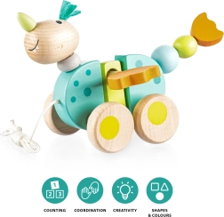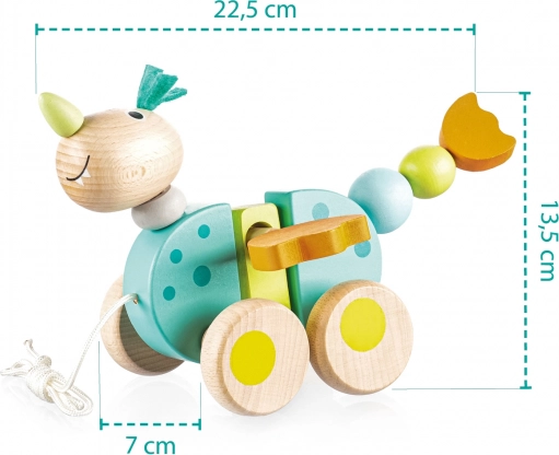 Táto drevená ťahacia hračka v tvare dráčika je skvelým spoločníkom pre malých objaviteľov. Pri chôdzi sa vďaka jednoduchému mechanizmu trepoce krídlami aj chvostíkom, čo deti baví a podporuje ich v prirodzenom pohybe. Odolné kolieska umožnia hravé jazdenie doma aj vonku.
