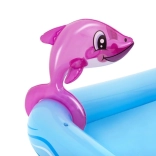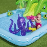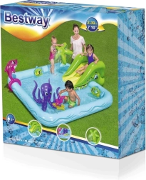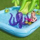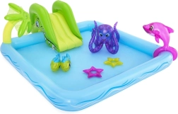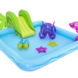 Rozveseľte záhradu vďaka detskému nafukovaciemu vodnému ihrisku BESTWAY s motívom morského akvária. Ponúka odnímateľnú šmýkačku, vodnú fontánu po pripojení hadice a množstvo nafukovacích hračiek (delfín, chobotnica, rybky a hviezdičky) na hodiny zábavy v horúcich dňoch. Odolný materiál PVC, bezpečnostné ventily a jednoduché vypúšťanie vody zaisťujú pohodlné a bezpečné používanie.