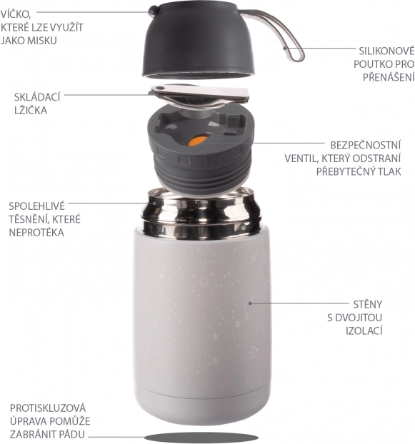 Súčasťou je šikovná skladacia lyžička, ktorá skvele pasuje do uzáveru a dieťa si tak môže dopriať teplú kašu alebo polievku kdekoľvek. Viečko termosky možno použiť ako hrnček či misku. Vrchný uzáver je opatrený bezpečnostným ventilom, ktorý uvoľní nadbytočný vzduch vytvárajúci tlak. Vďaka uvoľneniu stlačeného vzduchu možno nádobu ľahko otvoriť a predchádza sa prípadnému obareniu parou.