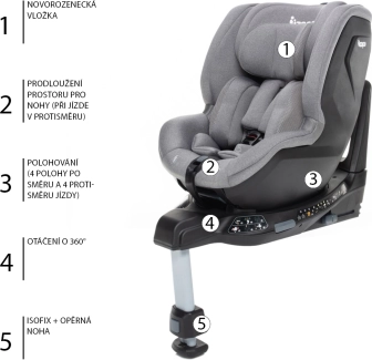 Autosedačka prešla najnáročnejšími testami v Holandsku, spĺňa normu ECE R129 i-Size a bude vyhovovať deťom od narodenia až do 105 cm výšky alebo 18 kg. Je plne otočná (360 °), čo umožňuje nielen meniť smer cestovania vo všetkých 4 nastaviteľných polohách, ale tiež zaručuje oveľa pohodlnejšiu manipuláciu s dieťaťom pri nastupovaní a vystupovaní.