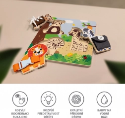 Zebra, lev a opica deti sprevádzajú svetom tvarov a farieb. Puzzle rozvíjajú sústredenie, koordináciu ruka–oko a priestorové vnímanie.