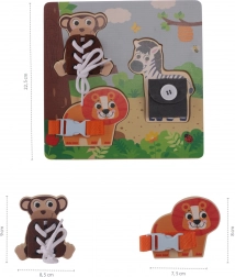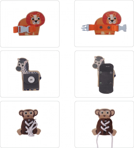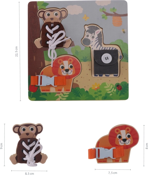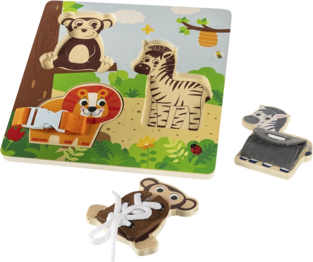 Toto kvalitné drevené montessori puzzle prináša deťom farebný svet safari s obľúbenými zvieratkami, ako je lev, zebra a opica. Každý dielik ponúka inú úlohu – zapnúť pracku, zaviazať šnúrku alebo zapnúť gombík – vďaka čomu deti prirodzene trénujú samostatnosť a trpezlivosť.
