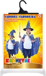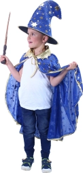 Tento exkluzívny čarodejnícky set zaručuje, že na žiadnej akcii neostanete nepovšimnutí! Modrý plášť je zdobený zlatým lemovaním a hviezdami, ktoré dodávajú na efektívnosti. Klobúk perfektne ladí s plášťom a dotvára celkový dojem. Ideálny pre oslavy Halloweenu alebo akýkoľvek tematický karneval.