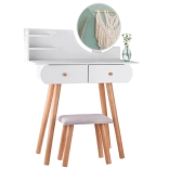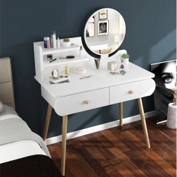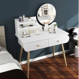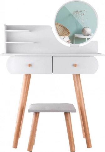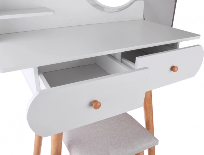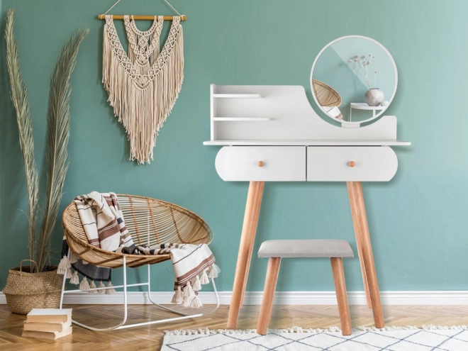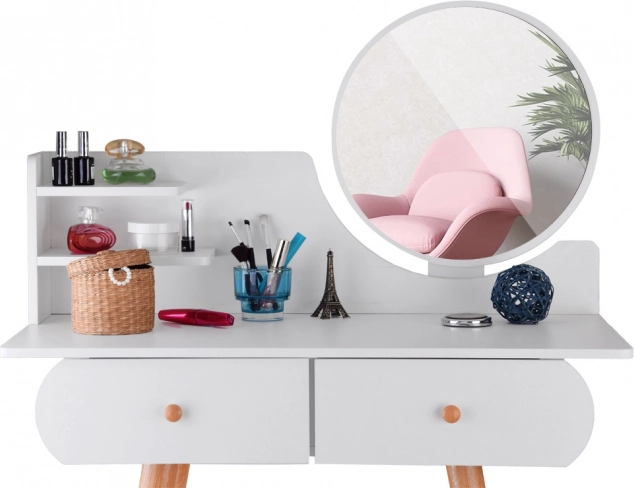 Funkčný minimalistický toaletný stolík v škandinávskom štýle sa môže stať skvelým doplnkom dievčenskej izby. Biely toaletný stolík s okrúhlym zrkadlom, priestrannými zásuvkami a pohodlnou stoličkou bude ideálny na nanášanie make-upu, česanie vlasov, úpravu oblečenia a dokonca aj písanie denníka.
