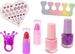 2× lak na nechty, samolepky na nechty, separátor prstov, štetček, 2× mini rúž, prstienok s balzamom (korunka)