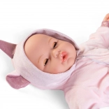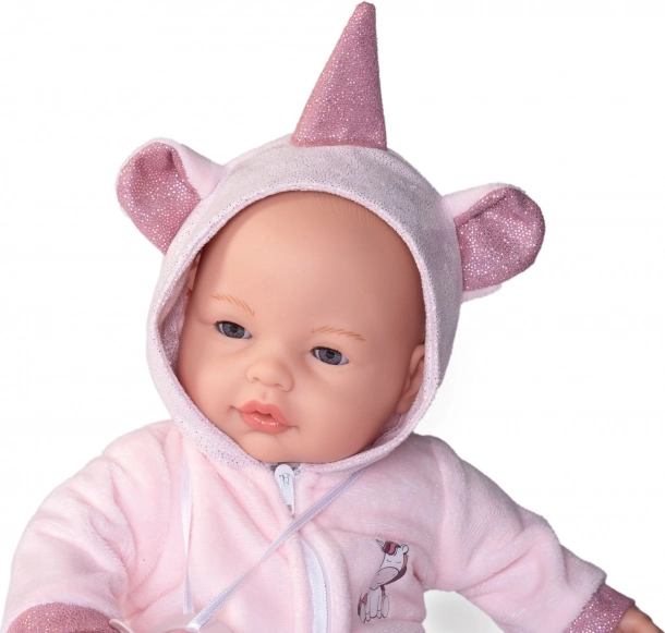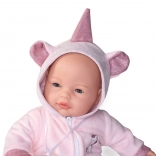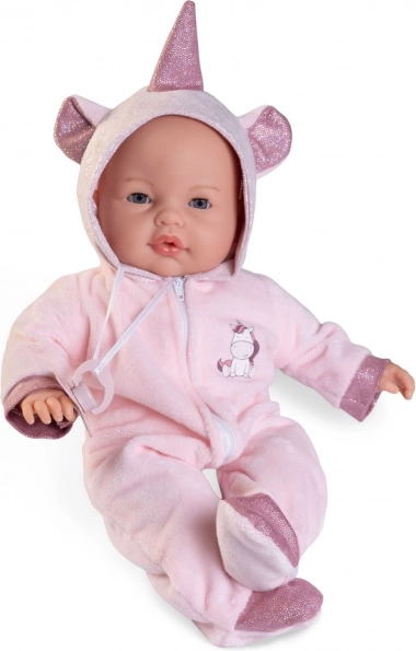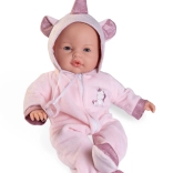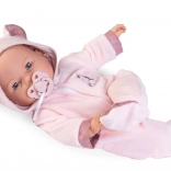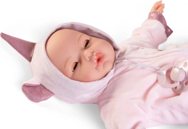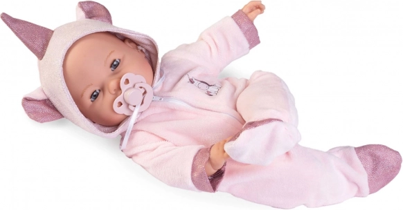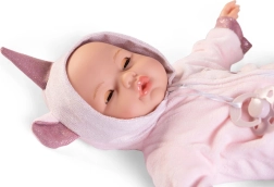Bábika vydáva autentické zvuky plačúceho dieťaťa a hovorí „mama“, „papa“, keď jej vyberiete cumlík.