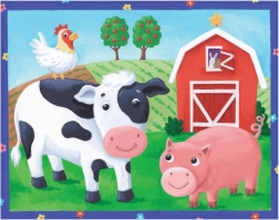 Objavte svet zvieratiek na farme – kravička, prasiatko a kohút potešia malých staviteľov, zatiaľ čo z červenej stodoly vykúka zajačik. Pozadie s kopcom a jabloňami podporuje fantáziu aj rozprávanie príbehov. Puzzle je navrhnuté pre malé detské ruky, dieliky sú extra silné a ľahko sa skladajú.