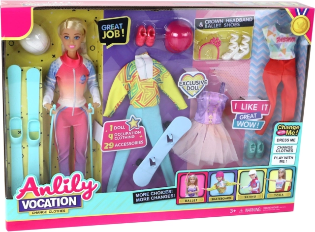 - Bábika Anlily, lyžiarsky set (kombinéza, lyže, paličky, prilba, zimné topánky), baletný set (fialový dres, ružová tylová sukňa, čelenka, baleríny), jogový outfit, set na jazdu na doske (doska, prilba, športové topánky, oblečenie)