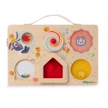 Drevený panel v tvare kufríka s obľúbenými motívmi z farmy, ktorý možno ľahko vziať kamkoľvek so sebou, prináša zábavný spôsob pre deti, ako objavovať svet. Tento panel umožňuje deťom už od jedného roka zapojiť sa do rozmanitých aktivít, ktoré ich nielen bavia, ale aj vzdelávajú.