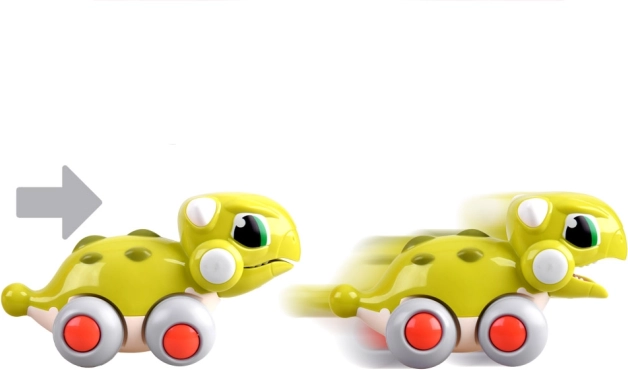 Tento veselý dinosaurus premení každú podlahu na dobrodružnú jazdu. Deti ho jednoducho postrčia a on sa rozbehne dopredu, pričom sa mu otvára a zatvára tlama – efektný detail, ktorý podporuje predstavivosť aj zmyslové vnímanie.