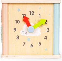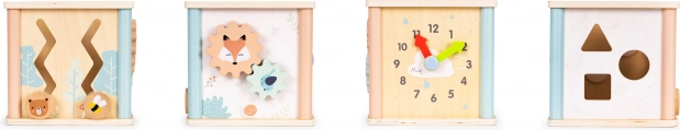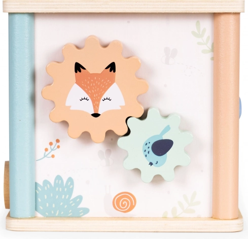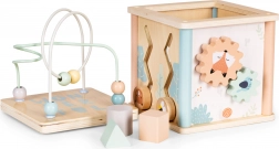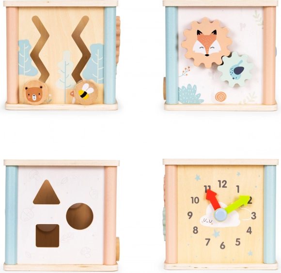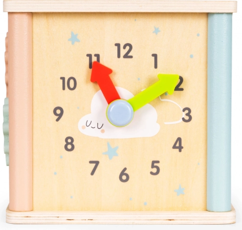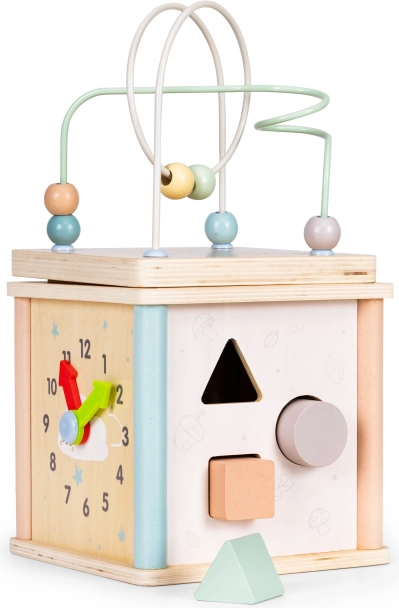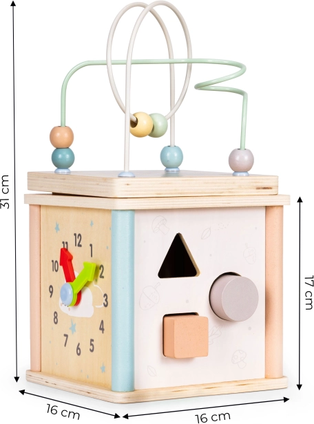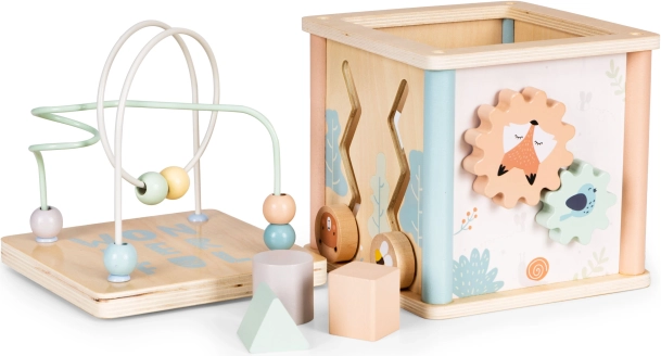 Multifunkčná drevená aktívna kocka ECOTOYS prináša deťom zábavu aj učenie v jednom. Ponúka guľôčkový labyrint, otáčacie ozubené kolieska, hodiny s pohyblivými ručičkami a sortér tvarov s farebnými kockami. Rozvíja jemnú motoriku, koordináciu oko–ruka, rozpoznávanie farieb a tvarov a podporuje samostatnú hru. Bezpečné prevedenie a príjemné pastelové farby potešia deti aj rodičov.