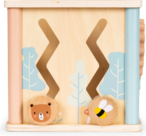 Horné veko s dráhami a korálikmi možno zložiť, takže sa s kockou ľahko manipuluje a upratuje. Kvalitné drevo, hladké hrany a certifikácia CE a EN71 zaručujú bezpečnú hru pre deti od cca 18 mesiacov.