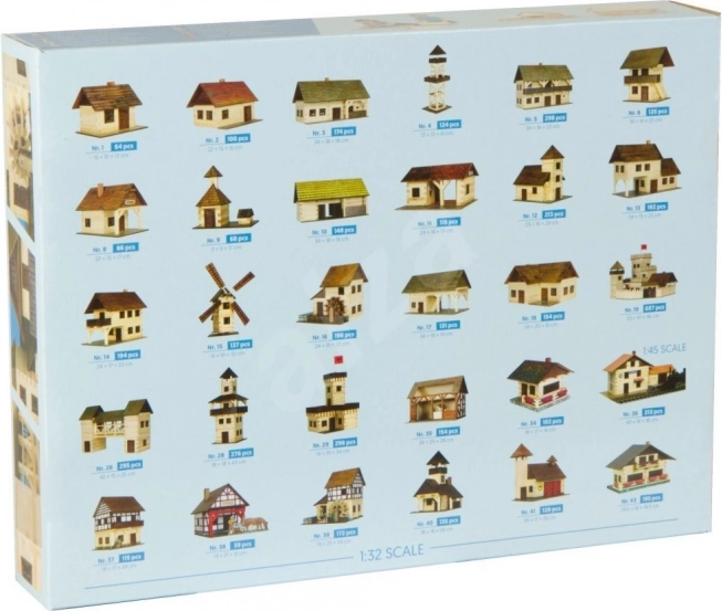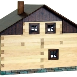 - Balenie obsahuje: drevené hranolčeky daných dĺžok, diely na strechy a štíty, kartónové výseky okien a dverí, predtlačené papierové potlače, schematický montážny plán.