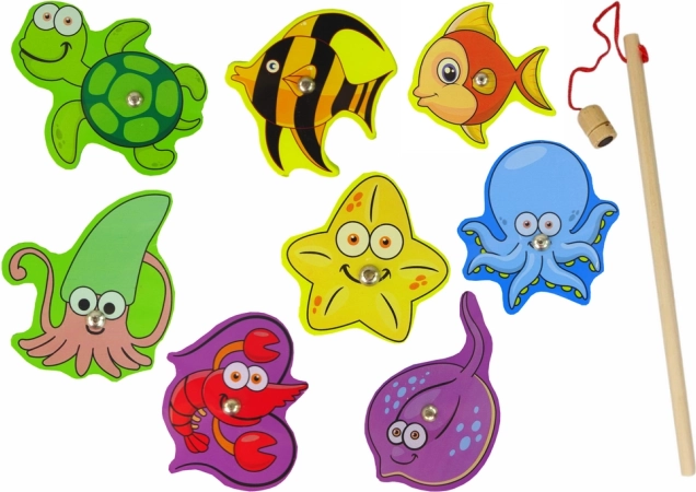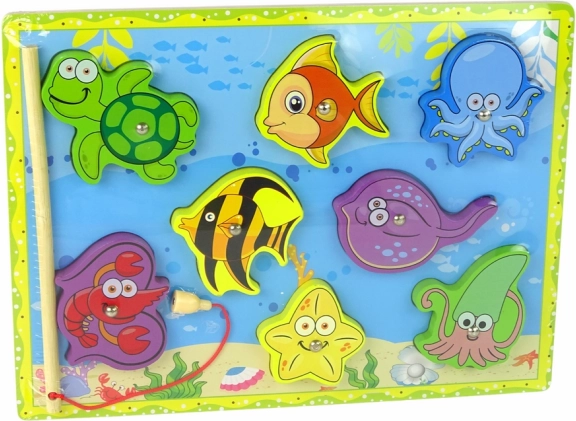 Drevená sada na chytanie morských zvierat je vybavená krásne ilustrovanou doskou predstavujúcou morské dno, ktorá deťom ponúka úchvatný pohľad do podmorského sveta. Rôznorodé drevené figúrky zvierat možno zábavne umiestňovať a vďaka vstavaným magnetom chytať pomocou drevenej udice.