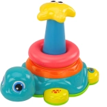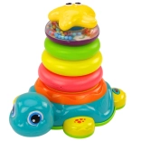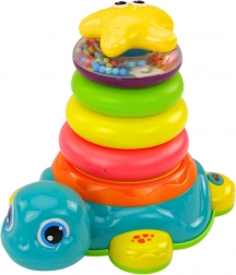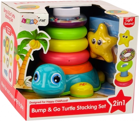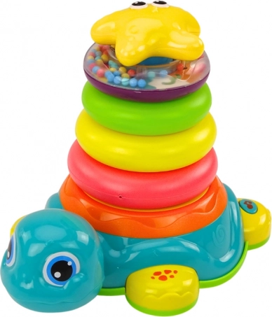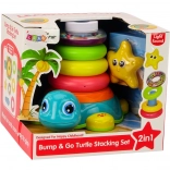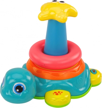 Pyramída Jazdiaca korytnačka 2v1 je dynamická hračka, ktorá kombinuje zábavu so vzdelávaním. Základňa v tvare jazdiacej korytnačky reaguje na prekážky a poskytuje svetelné a zvukové efekty, čím robí hru interaktívnejšou.
