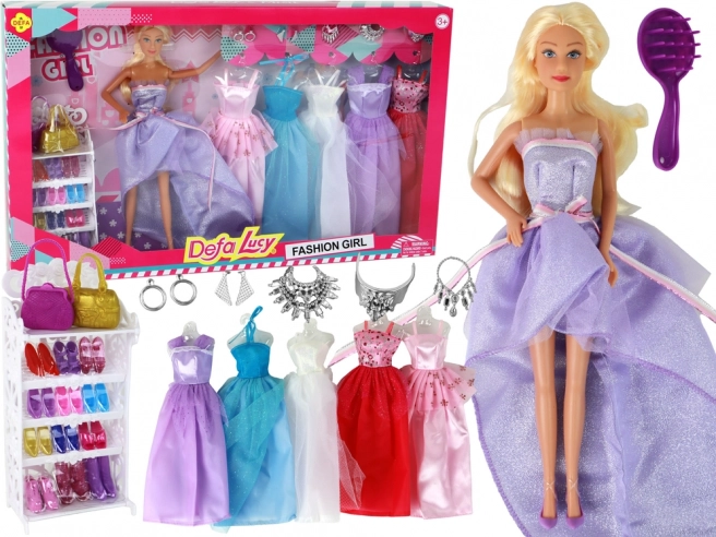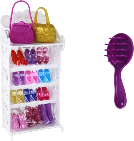 Súčasťou je biely šatník s 12 pármi topánok na opätku, dve kabelky, šperky, hrebeň a sponka do vlasov – všetko, čo je potrebné na kreatívnu hru a rozvoj fantázie. Hračka má certifikáciu CE, spĺňa normu EN 71 a je vhodná pre deti od 3 rokov.