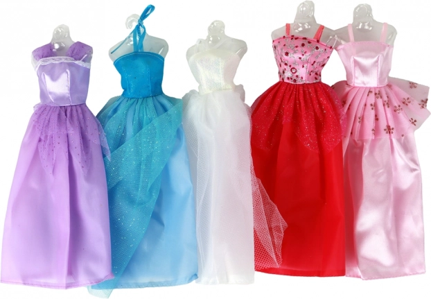 Sada obsahuje 5 štýlových šiat (biela, fialová, tmavoružová, modrá a svetloružová) s tylovými a trblietavými detailmi. Ľahko sa obliekajú a podporujú kreatívne prezliekanie.