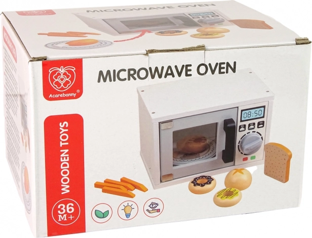 Štýlová drevená mikrovlnka v bielej farbe je perfektným doplnkom do každej detskej kuchynky. Podporuje hru na role, má magnetické dvierka, klikací otočný gombík a prichádza s bohatým príslušenstvom. Vyrobená z kvalitného dreva a bezpečne lakovaná podľa noriem CE a EN 71, vhodná pre deti od 3 rokov.