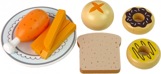 Tanier, 2× donut, žemľa, krajec chleba, 4× hranolky a kuracie stehienko – všetko pripravené na kreatívne servírovanie a zábavné scénky.