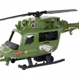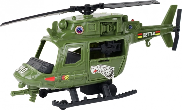 Zelený bojový vrtuľník s priehľadným kokpitom a detailnými potlačami prináša do hry akciu a realizmus. Svetelné a zvukové efekty podporia atmosféru každej misie.