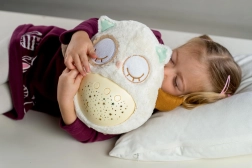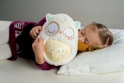 Tento mäkučký plyšový uspávačik kombinuje hrejivé objatie s chytrými funkciami na zaspávanie. Sovička premieta hviezdnu oblohu v 8 farbách, prehráva 8 uspávaniek a upokojujúce prenatálne zvuky, na ktoré sú najmenší zvyknutí z mamininho bruška. Po dohraní melódie ešte približne minútu jemne svieti a potom sa automaticky vypne.