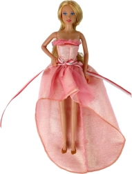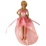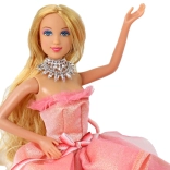 Bábika s dlhými blond vlasmi a modrými očami, oblečená v ružových šatách s nadýchaným topom a mašľou.