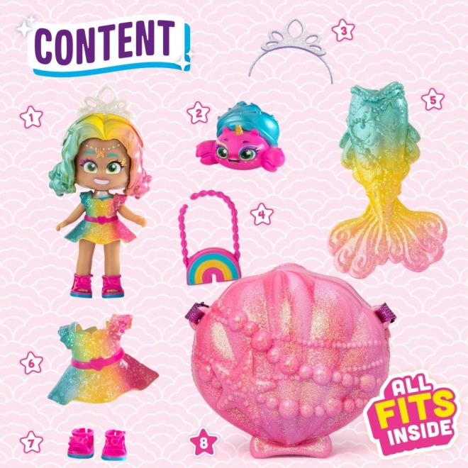Štýlová kabelka v tvare mušle, ktorú možno ľahko prenášať a používať ako originálny úložný priestor pre všetky poklady bábiky Coral.
