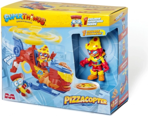 Objavte svet SuperThings s novou Pizzakoptérou! Tento vrtuľník je vybavený exkluzívnou postavičkou Kazoom Kid a ponúka vzrušujúci vystreľovací mechanizmus pre maximálnu hernú zábavu.