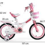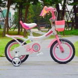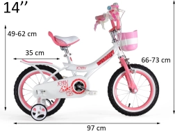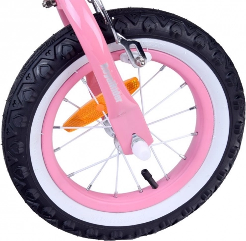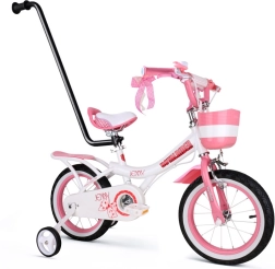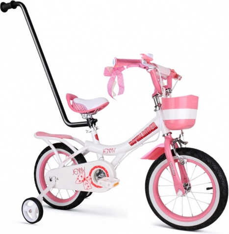 Štýlový detský bicykel ROYALBABY Jenny s kolesami 14'' je ideálny na prvé jazdy. Ponúka bočné stabilizačné kolieska, praktickú vodiacu tyč pre rodičov, oceľový rám a plný kryt reťaze pre bezpečie. Pohodlné sedlo s držadlom, ručné brzdy pre malé ruky a výbava ako košík, zvonček a odrazky zabezpečia bezpečnú a stabilnú jazdu pre deti od 3 rokov.