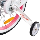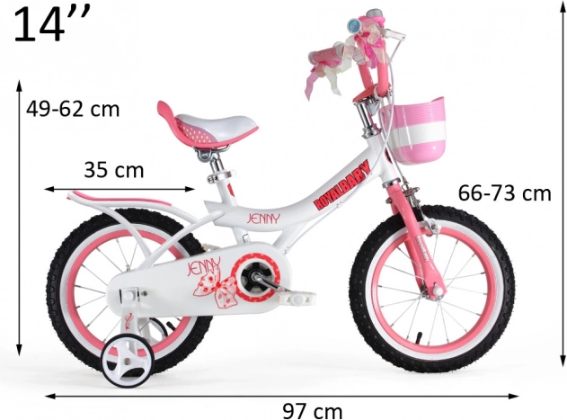 ROYALBABY Jenny 14'' je starostlivo navrhnutý detský bicykel pre začiatočníkov. Vďaka široko rozkročeným bočným kolieskam a vodiacej tyči pomáha budovať rovnováhu a istotu v sedle. Odolný oceľový rám, nafukovacie gumové pneumatiky a ergonomicky tvarované komponenty prinášajú pohodlie aj stabilitu pri každej jazde.