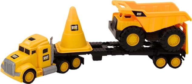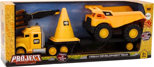 Tento realistický stavebný set poteší každé dieťa, ktoré miluje svety stavenísk. Žltý ťahač s návesom pohodlne prepraví sklápačku, veľký dopravný kužeľ vymedzí stavenisko a lopatka s hrabľami sa postarajú o hodiny zábavy na piesku aj na záhrade. Hračky sú vyrobené z kvalitného, odolného plastu, ktorý sa ľahko čistí.