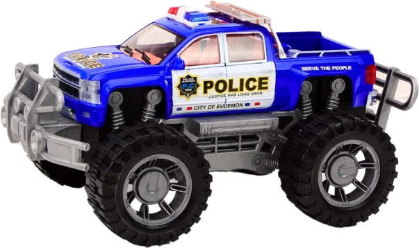 Auto má naťahovací pohon, takže po otočení zadných kolies sa samo rozbehne. Vďaka celkovému dizajnu a detailom hračka pripomína skutočné terénne policajné auto, ktoré iste poteší malých automobilových a policajných nadšencov.