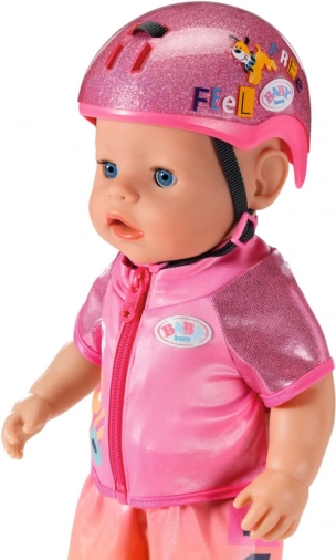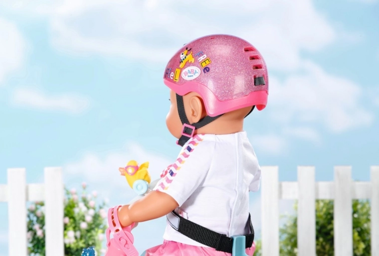 Prilba zaujme jasne ružovou farbou s trblietkami a zábavnými nálepkami – ideálna pre štýlové výjazdy bábiky BABY born.