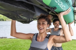 Dve vymeniteľné plutvy pre presné vedenie smeru, hliníkové pádla 230 cm a ručná pumpa v balení. Jednoduché nafúknutie, prenášanie aj skladovanie.