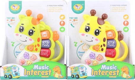 Plastové pianoko v tvare žirafy. Hrá a vydáva zvuky zvieratiek. Napájanie na 2 AAA batérie (sú súčasťou balenia). Rozmery pianoka cca 12 × 16 cm. Rozmery balenia cca 16 × 19 × 5 cm. Vek 12m+