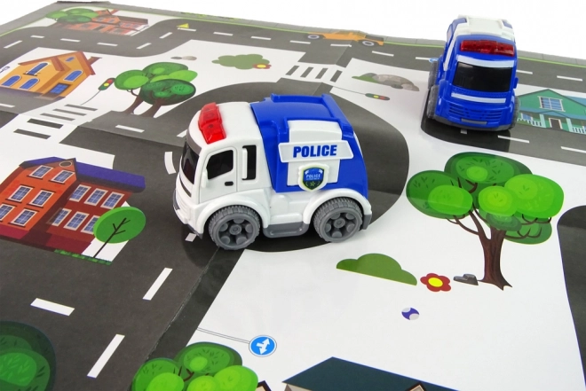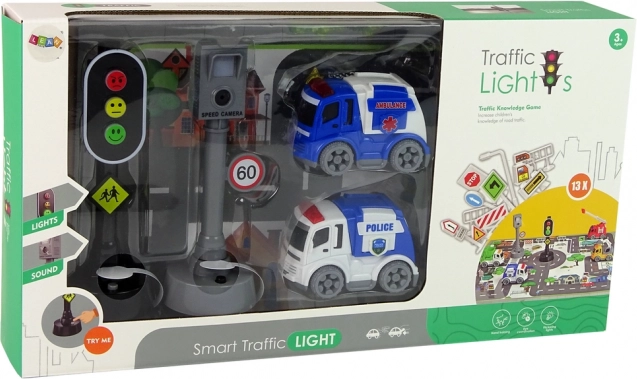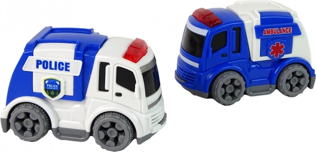 Súprava hračiek s motívom dopravy, ideálna pre deti, ktoré sa učia základné pravidlá cestnej premávky. Obsahuje policajné a sanitné vozidlo, ktoré sú ľahko uchopiteľné malými detskými rúčkami.